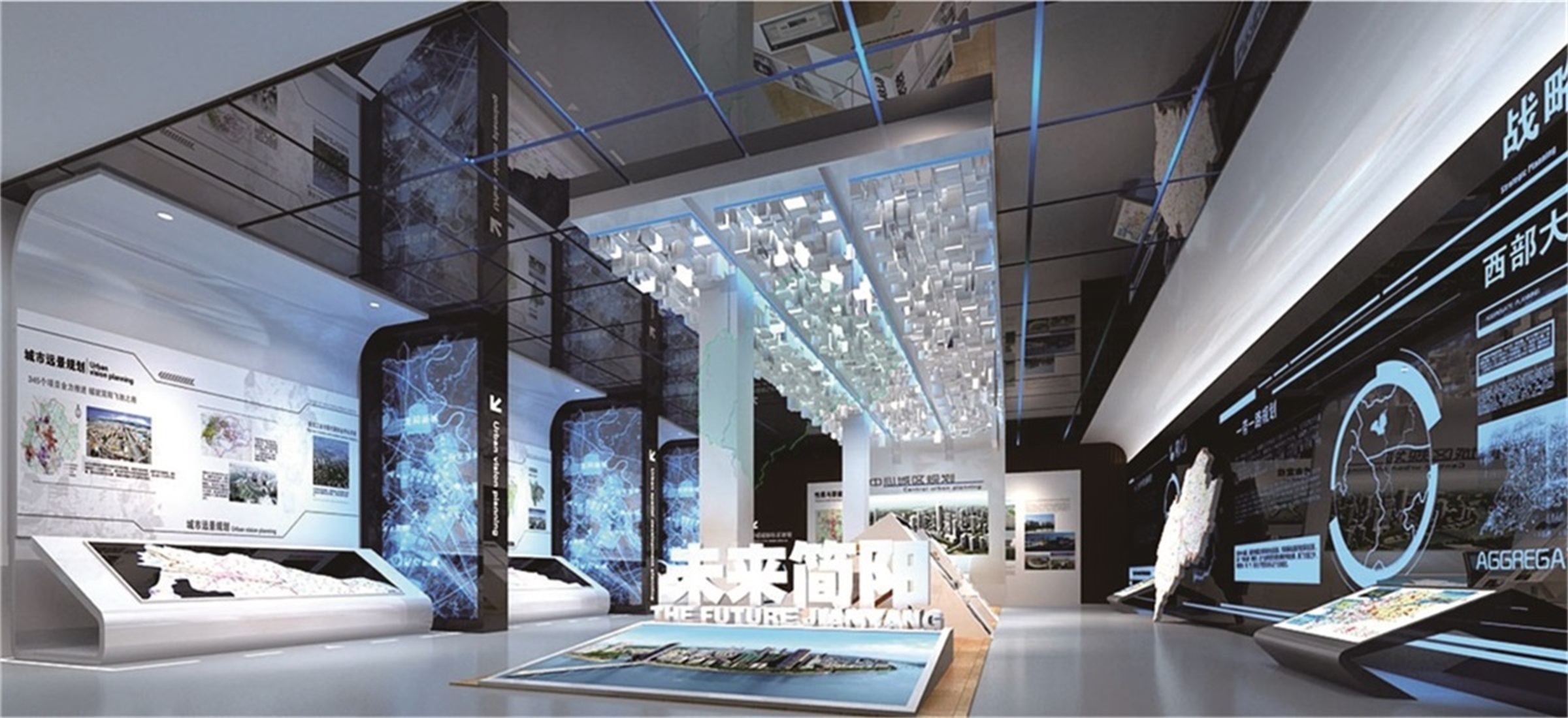 简阳规划馆,包括简阳历史人文、建设成果和战略规划、图书共享三大版块,是一个集规划展示、文化、教育、休闲等多功能于一体的综合性展览建筑,实现了规划展示公示功能、科技展示与教育功能、图书资料阅览功能、城市观光与休闲娱乐功能、会议与办公功能的全方位复合,将成为简阳城市文化新名片。通过艺术场景和雕塑,重现简阳文化历史的精华和风采,并通过展览呼吁人们对历史文化的尊重和保护。